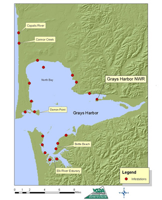 The map below shows infestation locations as of 2005 as determined by the Washington Department of Agriculture and Washington Department of Fish & Wildlife. Beginning in June of 2006 there was funding made available to further identify and attack the Grays Harbor Spartina infestation. |